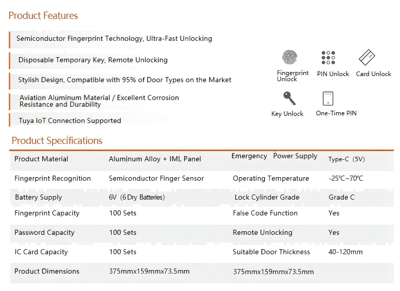 The lock is powered by 6 dry batteries for long-term use and features a Type-C emergency power supply port, allowing you to power it temporarily with a power bank if the batteries are depleted. It operates reliably in a wide operating temperature range from -25°C to 70°C, ensuring consistent performance in various climates.